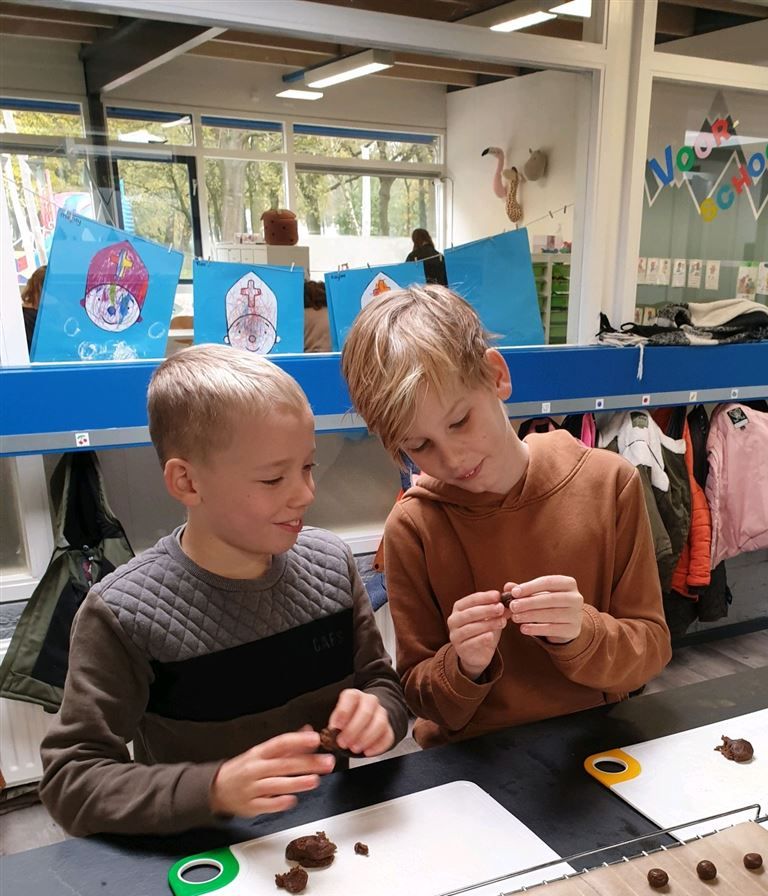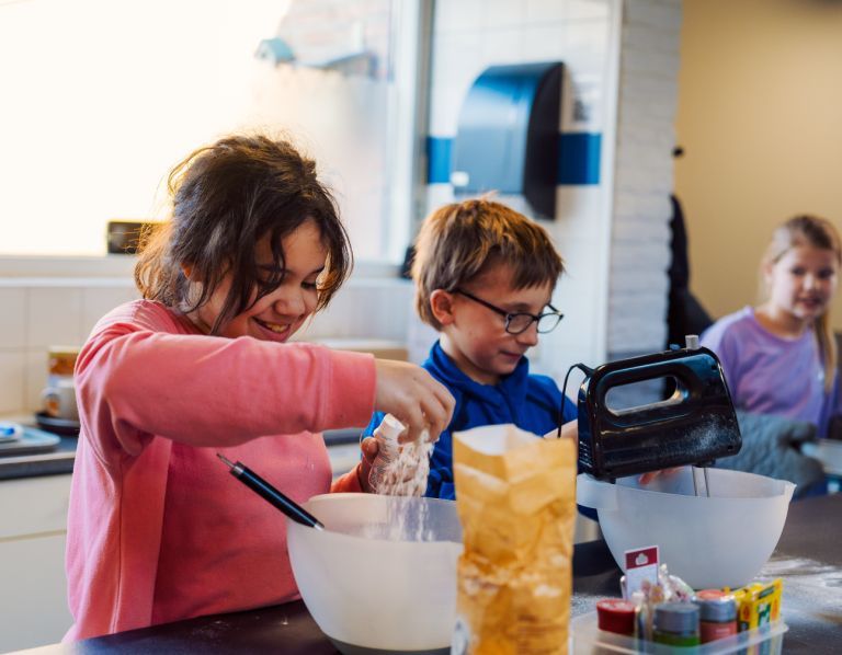 We beschikken over een mooie keuken met een groot kook eiland. Om dit kookeiland kunnen groepjes kinderen tegelijkertijd koken en bakken met elkaar. Naast dat dit natuurlijk erg leuk is, is het ook erg leerzaam. Je leert recepten lezen, wegen en afmeten, plannen, samenwerken en natuurlijk koken! Alle groepen komen geregeld aan bod om samen iets te kokkerellen in de keuken. Wat dacht u van pepernoten bakken of een heerlijke appeltaart. Maar ook het bereiden van een verse groente soep of het maken van loempia's behoort tot de mogelijkheden.